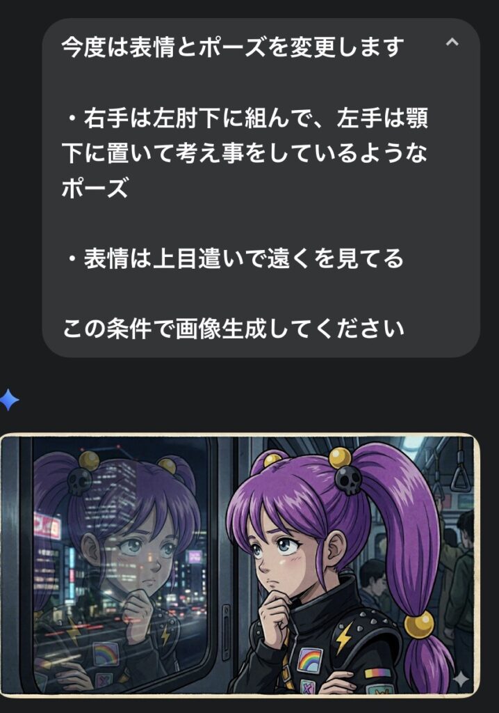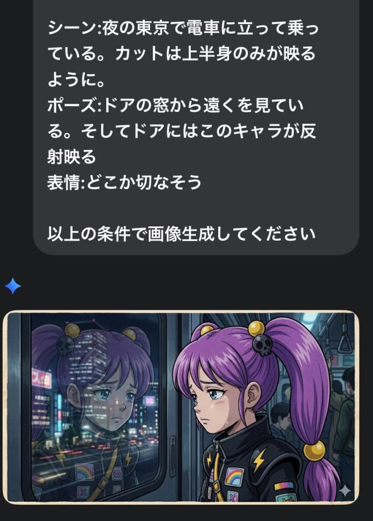 黒い服とか、〇〇風なタッチでとか表情はなんちゃらとか、でとりあえず出来たキャラで詰めてみます
