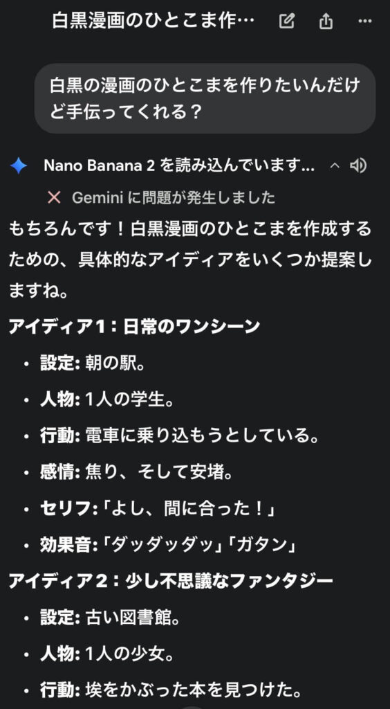 なのでレシピでも無く検索でも無く、漫画を作成したいのでお手伝いをしてくれる?と質問してみました